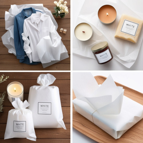 Цей тонкий, але досить міцний папір має білий колір та приємну текстуру, що робить його привабливим як для практичного використання, так і для творчих проектів. При використанні має приємний шурхіт, що робить його особливо популярним для зйомки відеорозпаковок. Ідеально підходить для пакування одягу, подарунків, сувенірів, мила ручної роботи. Також використовується для оформлення букетів, упакування крихких предметів.